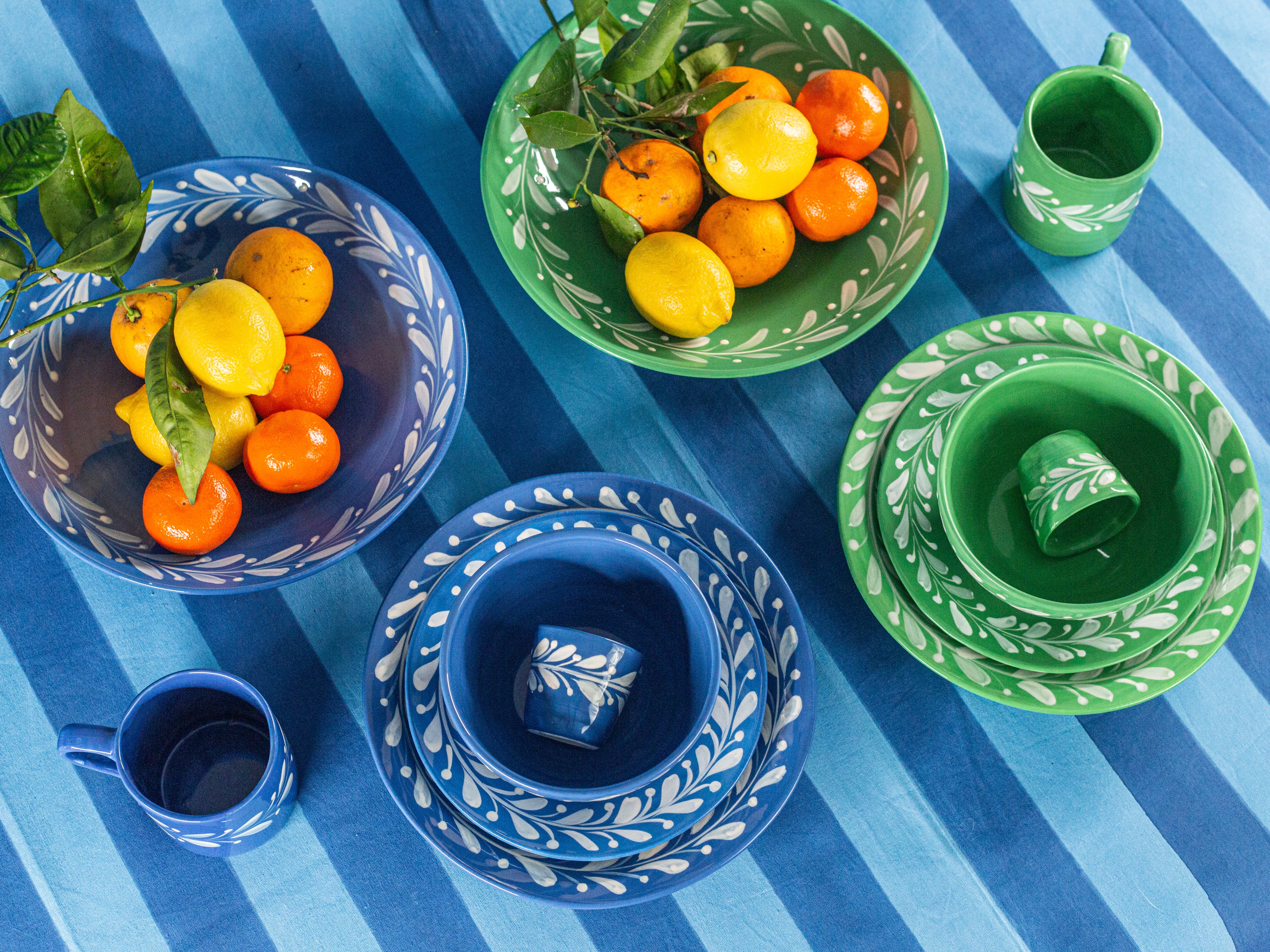 Inspired by an antique Greek dish featuring an intricate olive decoration, Anna boasts a painterly motif that is simplistic yet quietly impactful. Mix and match colorways for a spirited tabletop.