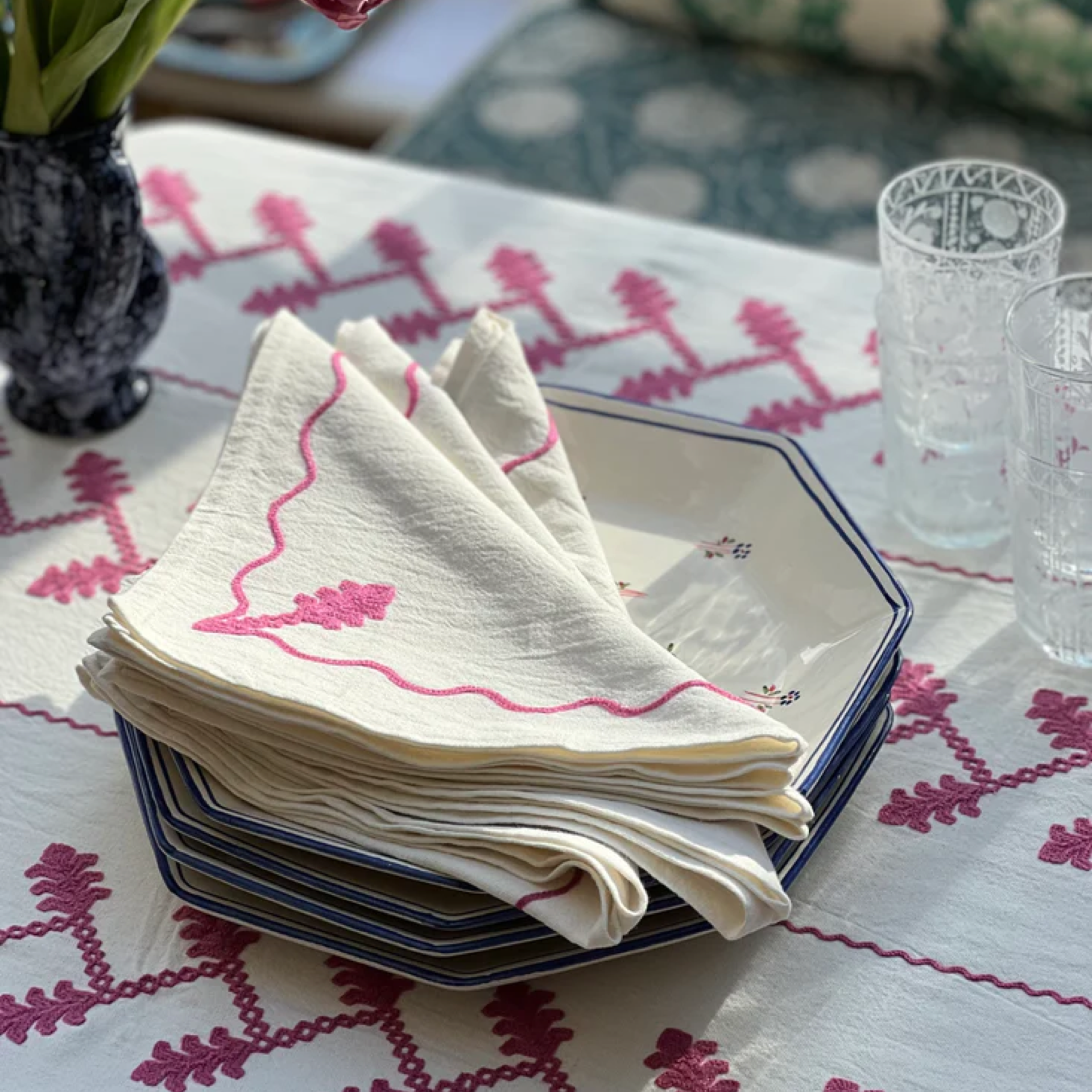 The motif for this tablecloth was inspired by Elizabethan blackwork and is embroidered in India. Originally in black and white, we have expanded the Vine collection to include pinks, blues and greens.