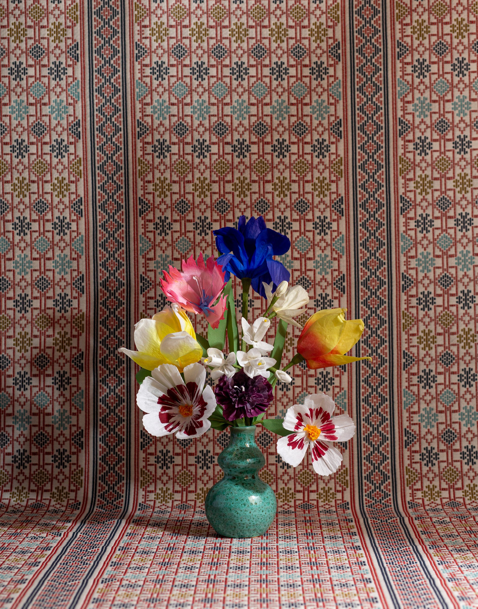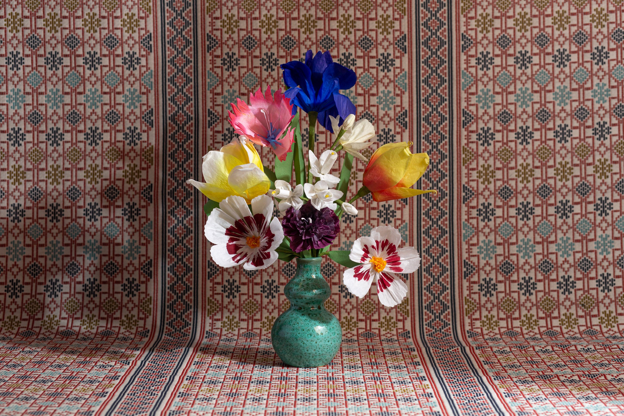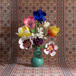 Handmade by the Green Vase, this bouquet of handmade flowers includes Carnations, Jonquils, Irises and Tulips.
